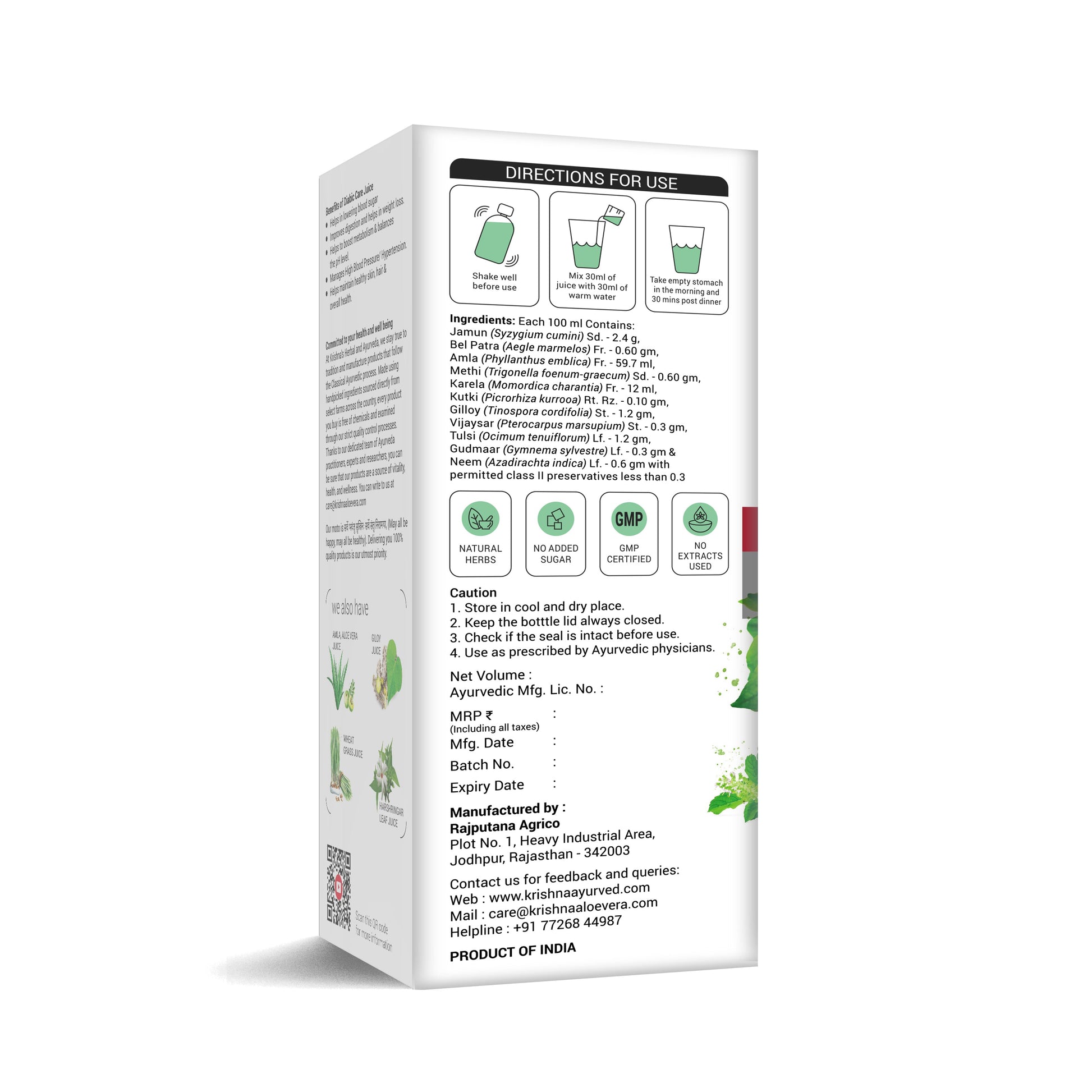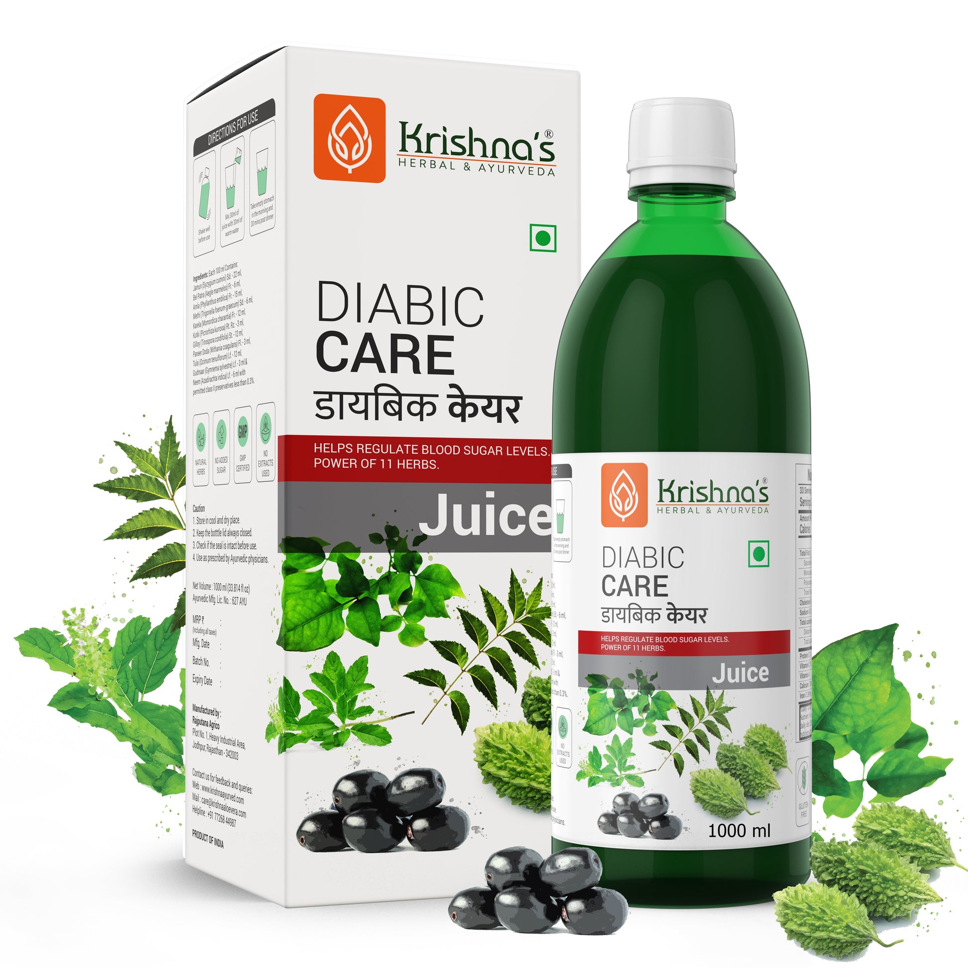 Krishna's Herbal & Ayurveda Diabic Care Juice is made using raw and pure herbs collected from reputable farms across India. This juice is prepared through traditional Ayurvedic processes and features six carefully selected ingredients: Methi, Amla, Karela, Jamun, Kutki, and Guduchi.